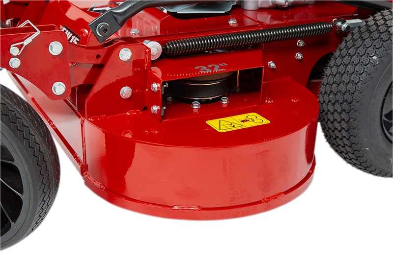 The compact 32″ reinforced steel deck comes with dual timed cutting blades and spring assisted height of cut adjustment lever for quick and simple height change. The Deck can be configured to either mulch or side discharge.